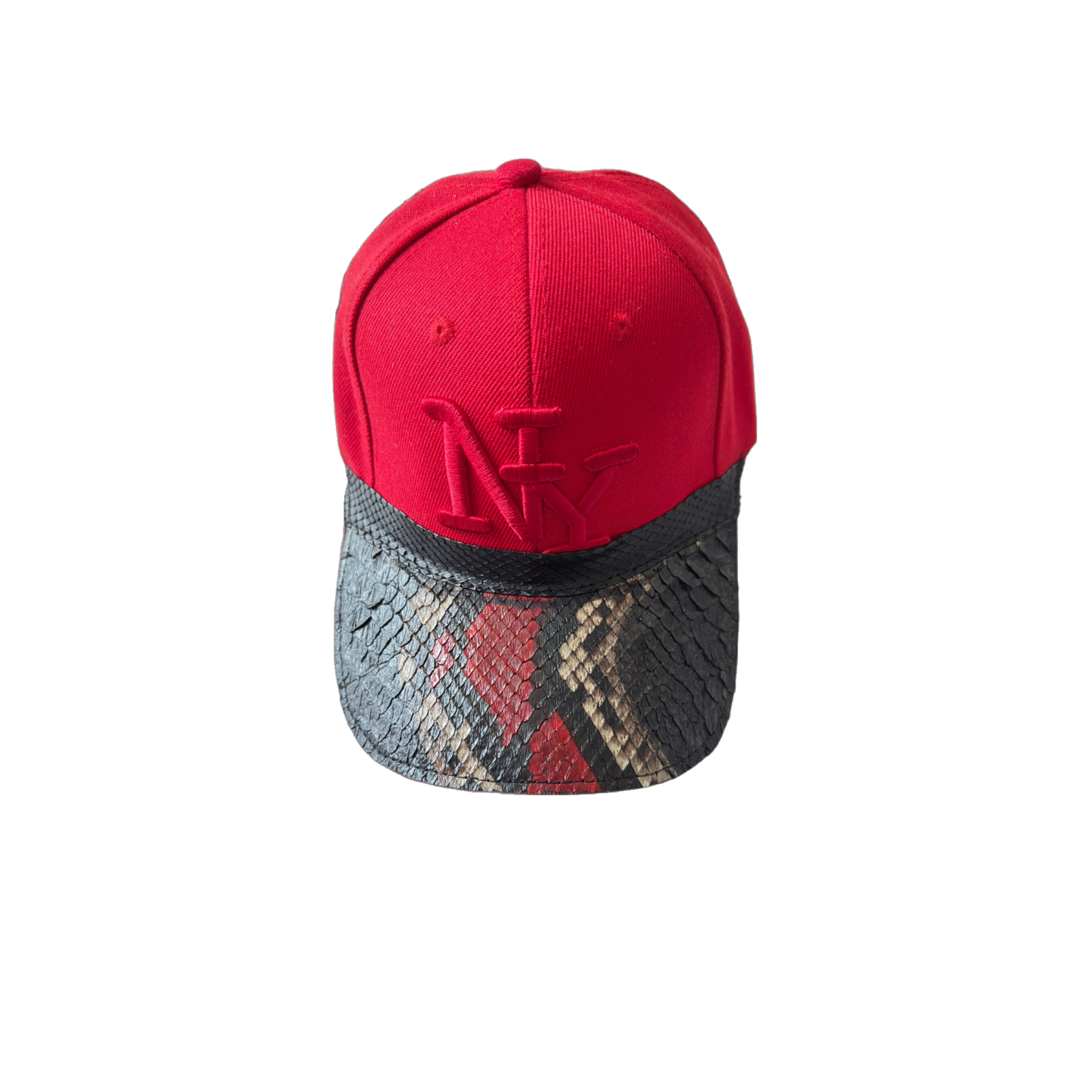 Fire red cotton with red white and black python exotic baseball cap made in NYC ships world wide