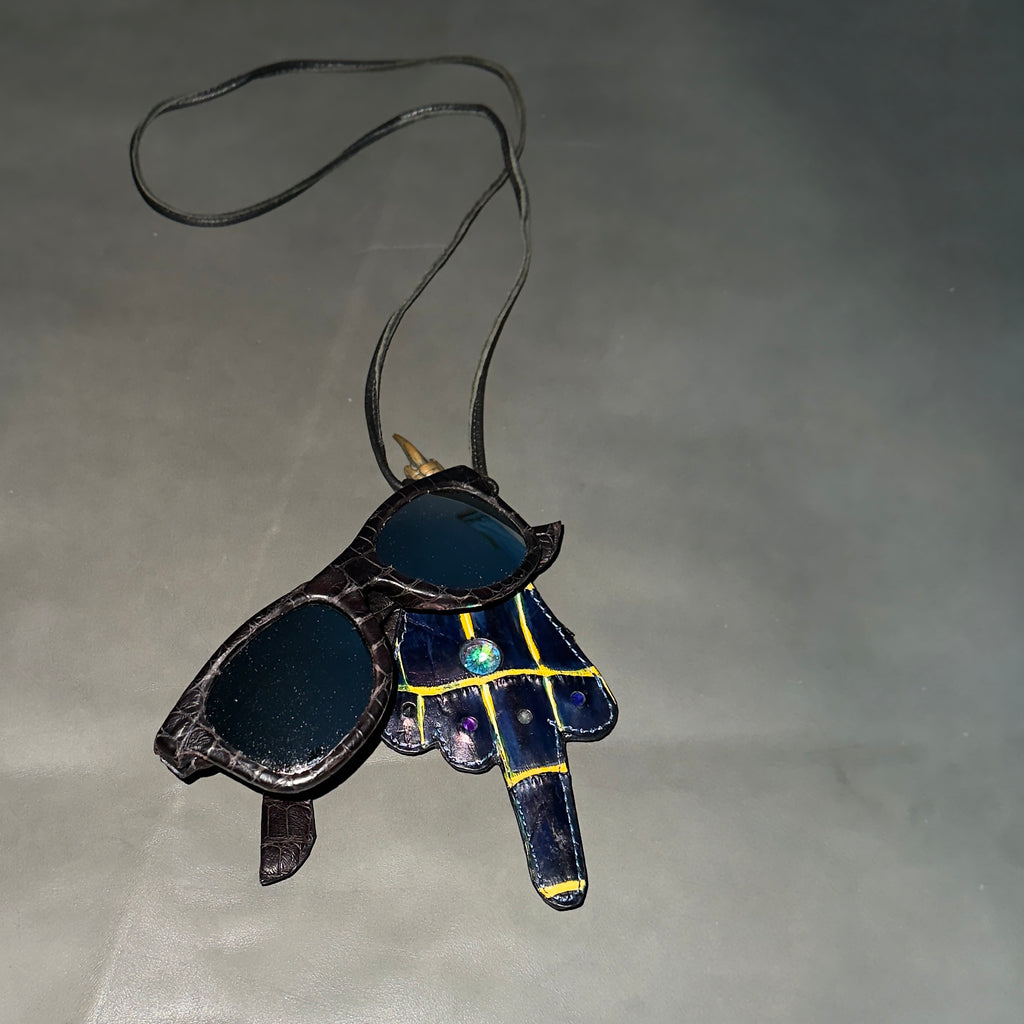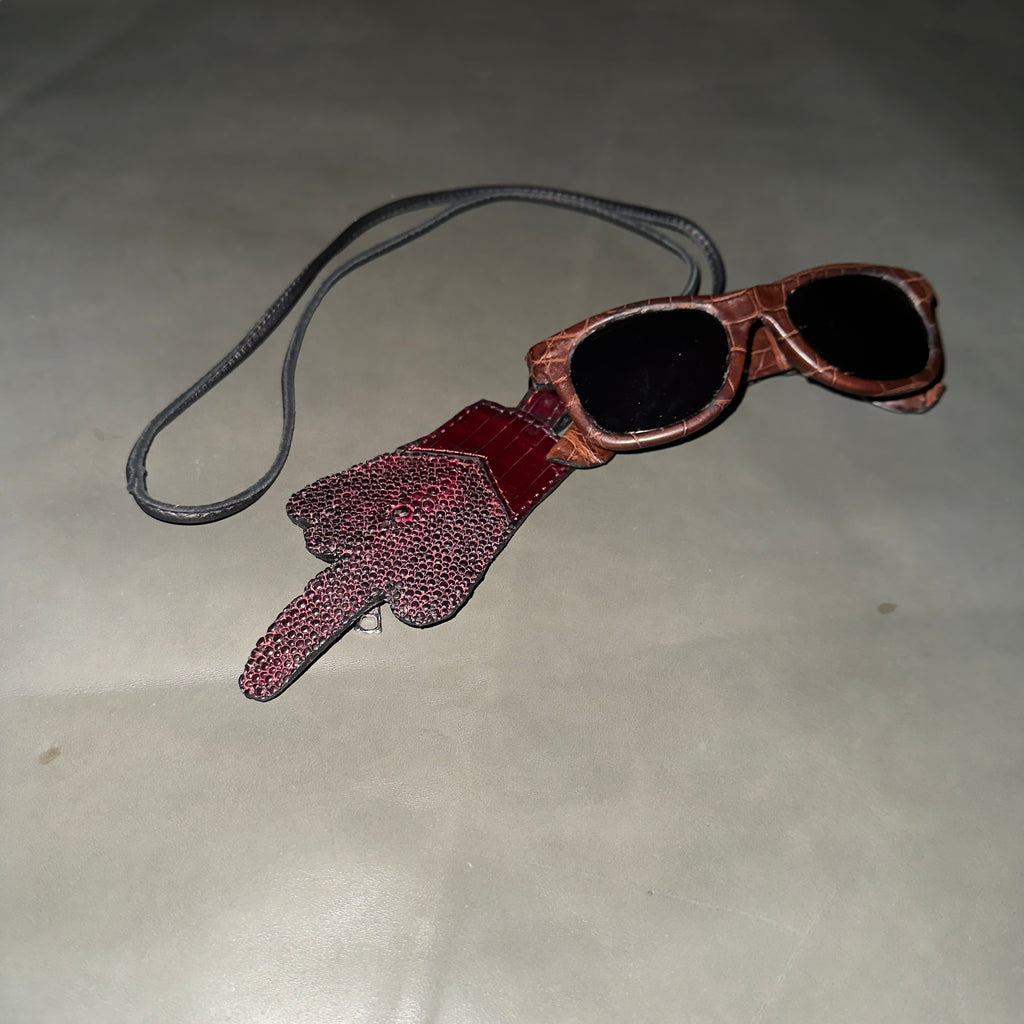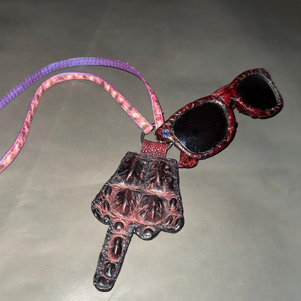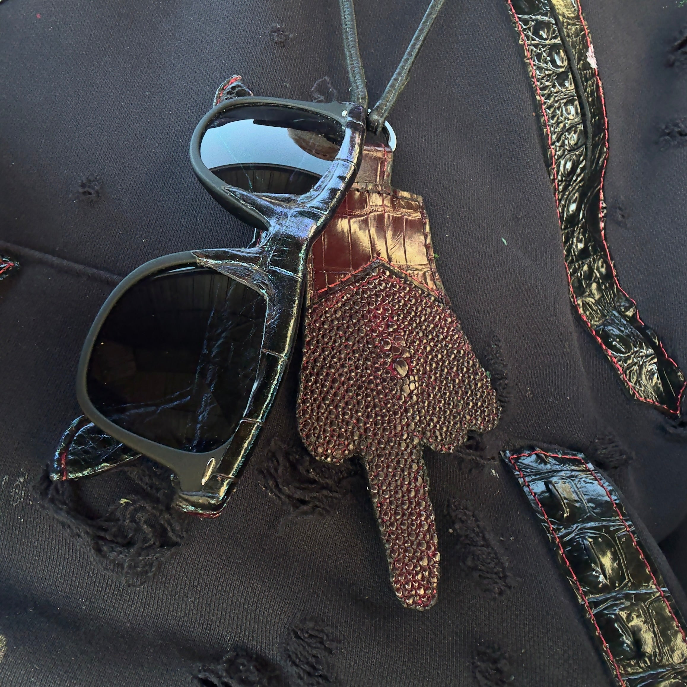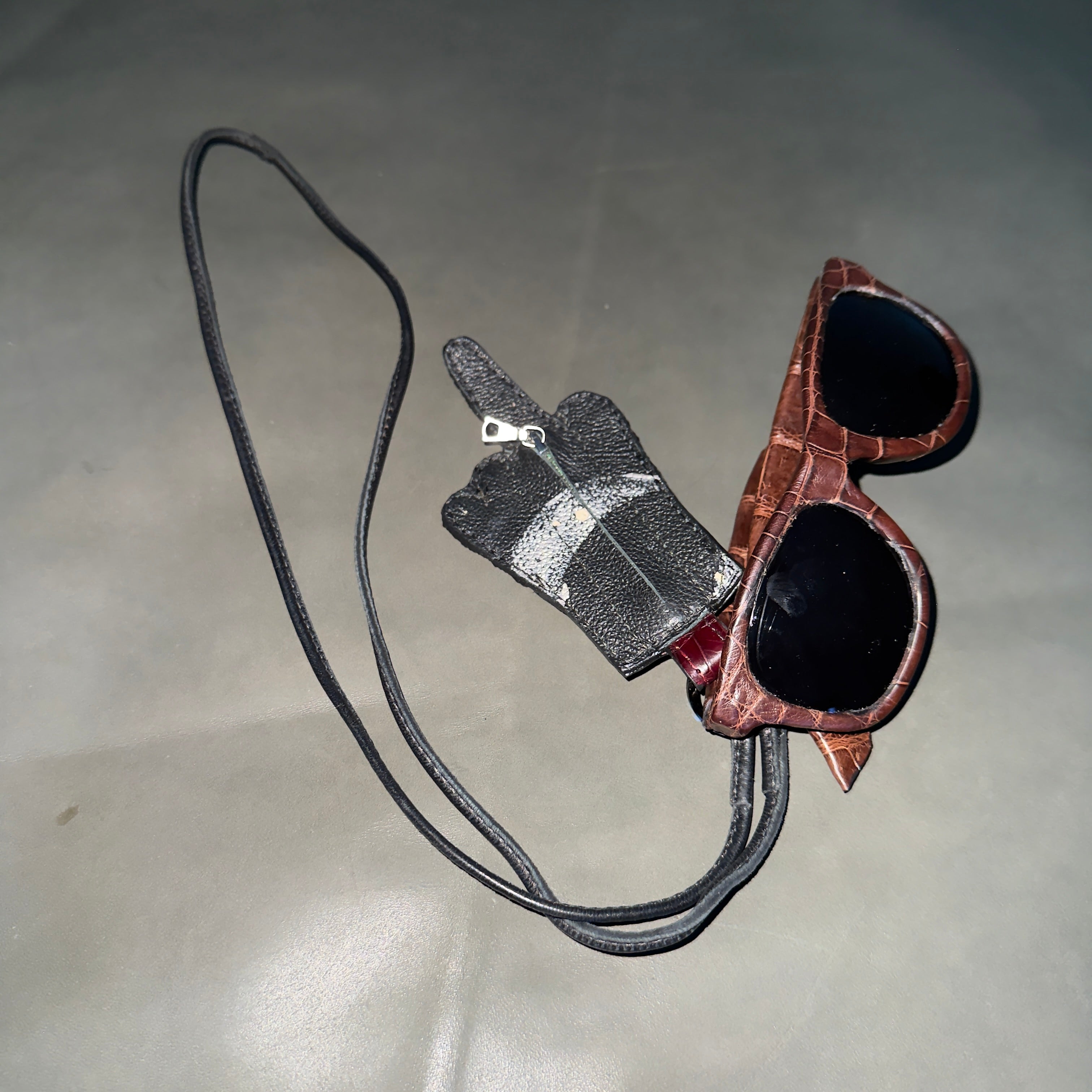 The sunglass necklace holder the best companion for our signature shades . These unique one of one MF Alligator and stingray designs can be worn as a necklace with or without the sunglasses a bold statement will be made each design also features a small pocket for air tags ,or whatever conveniently fits made in NY ships worldwide
