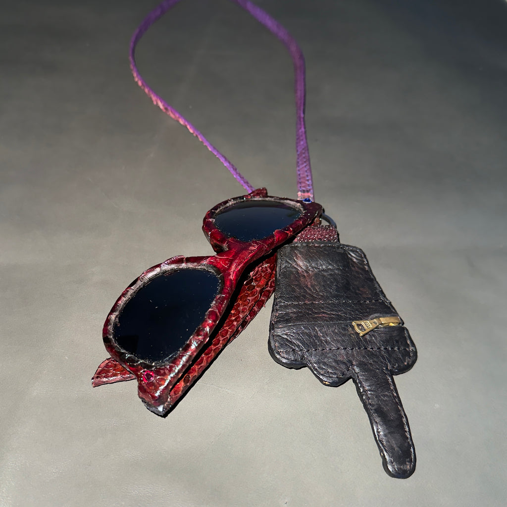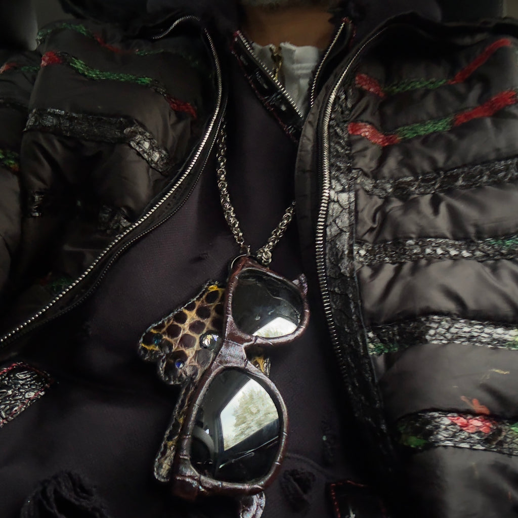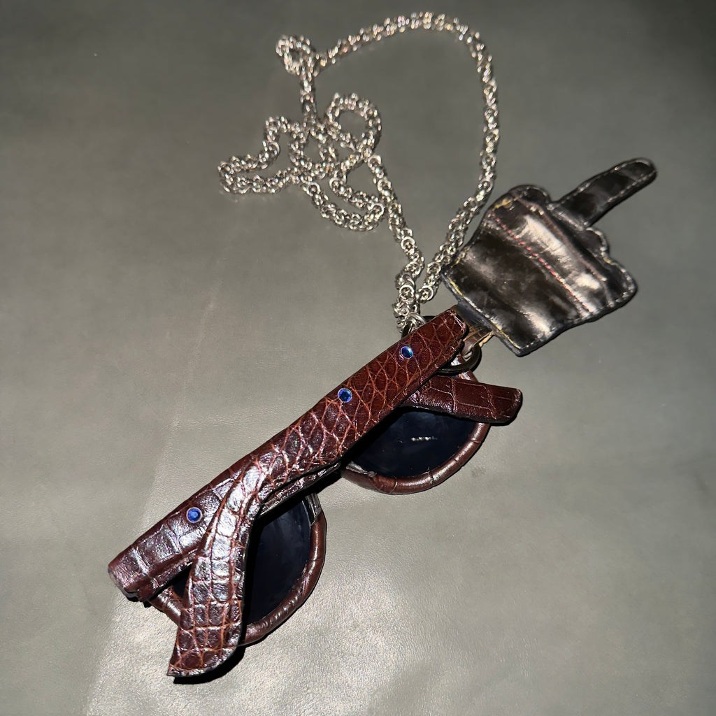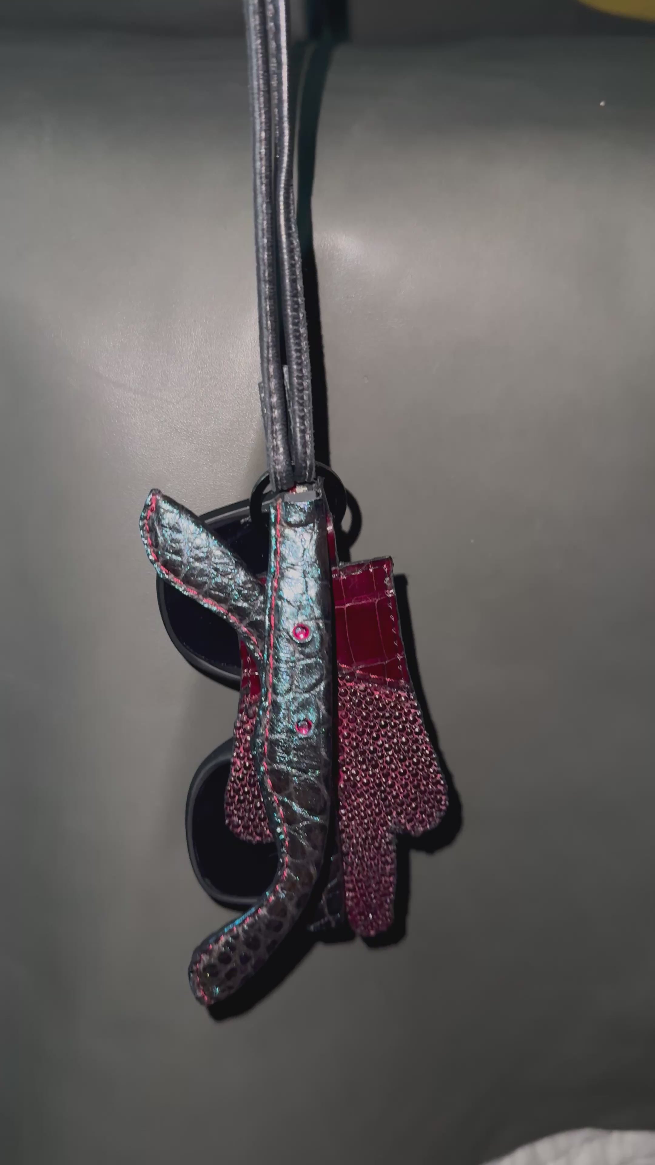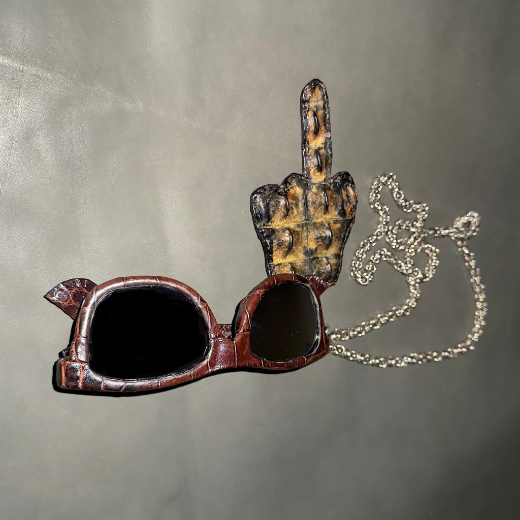 The sunglass necklace holder the best companion for our signature shades . These unique one of one MF Alligator and stingray designs can be worn as a necklace with or without the sunglasses a bold statement will be made each design also features a small pocket for air tags ,or whatever conveniently fits made in NY ships worldwide