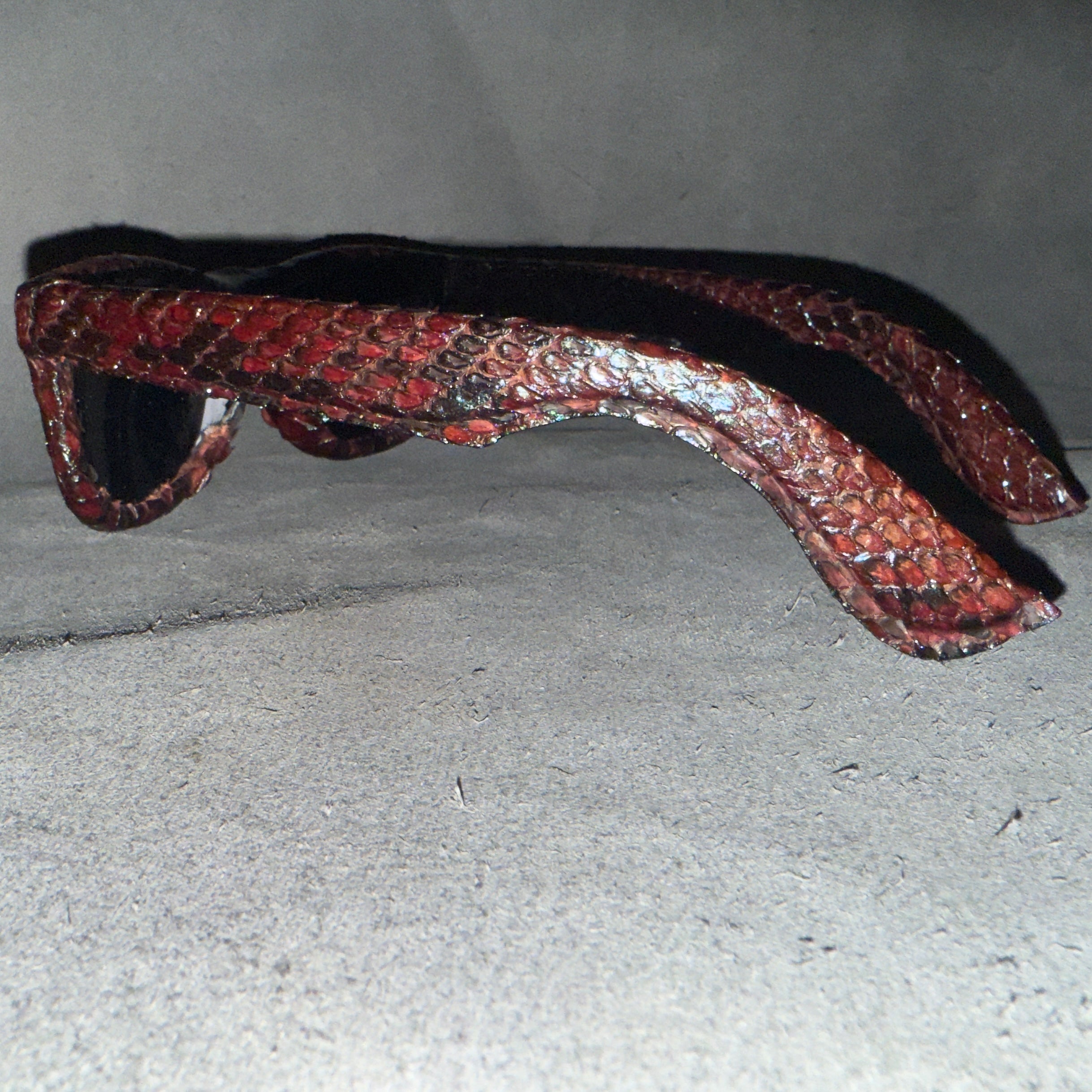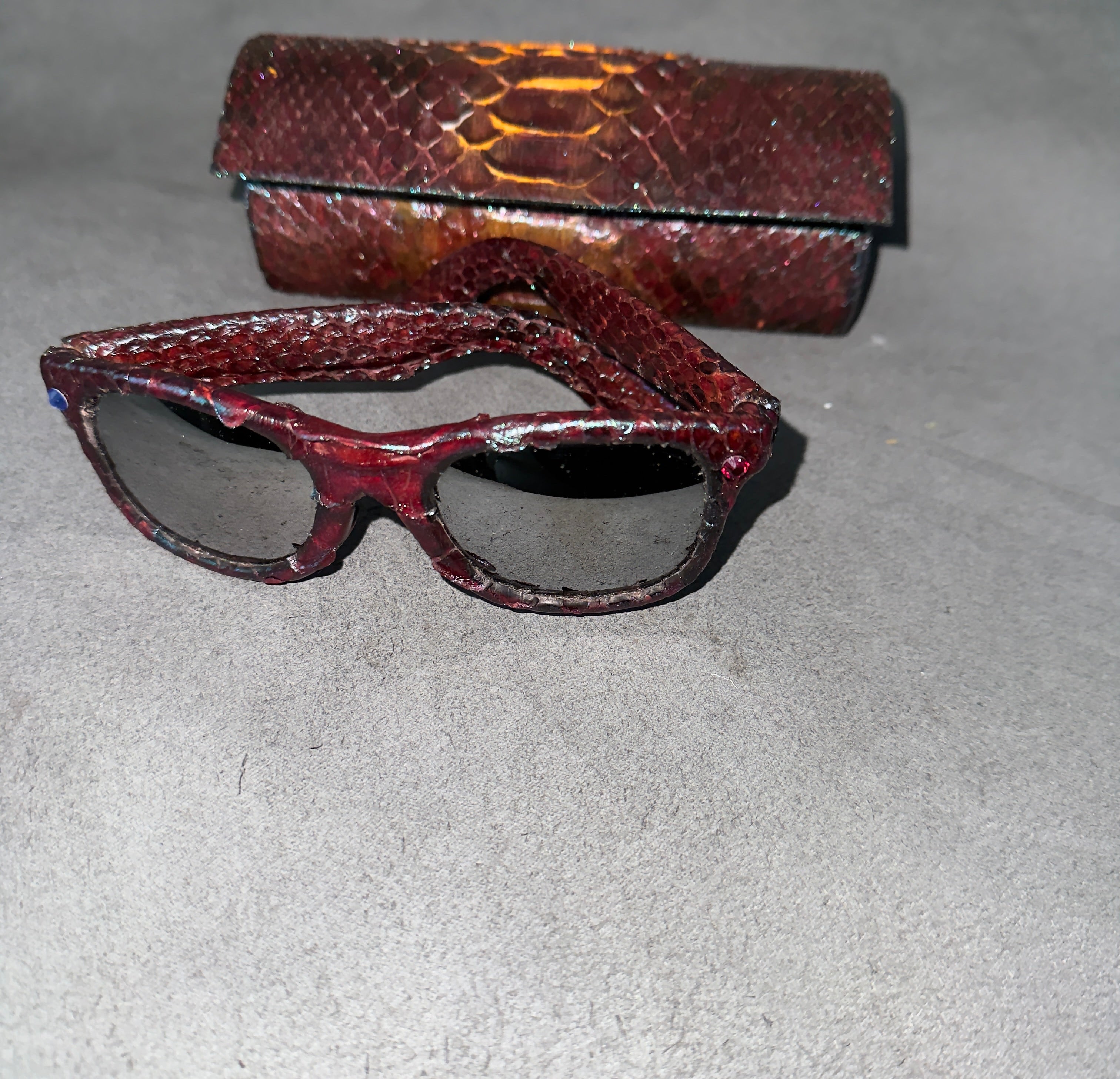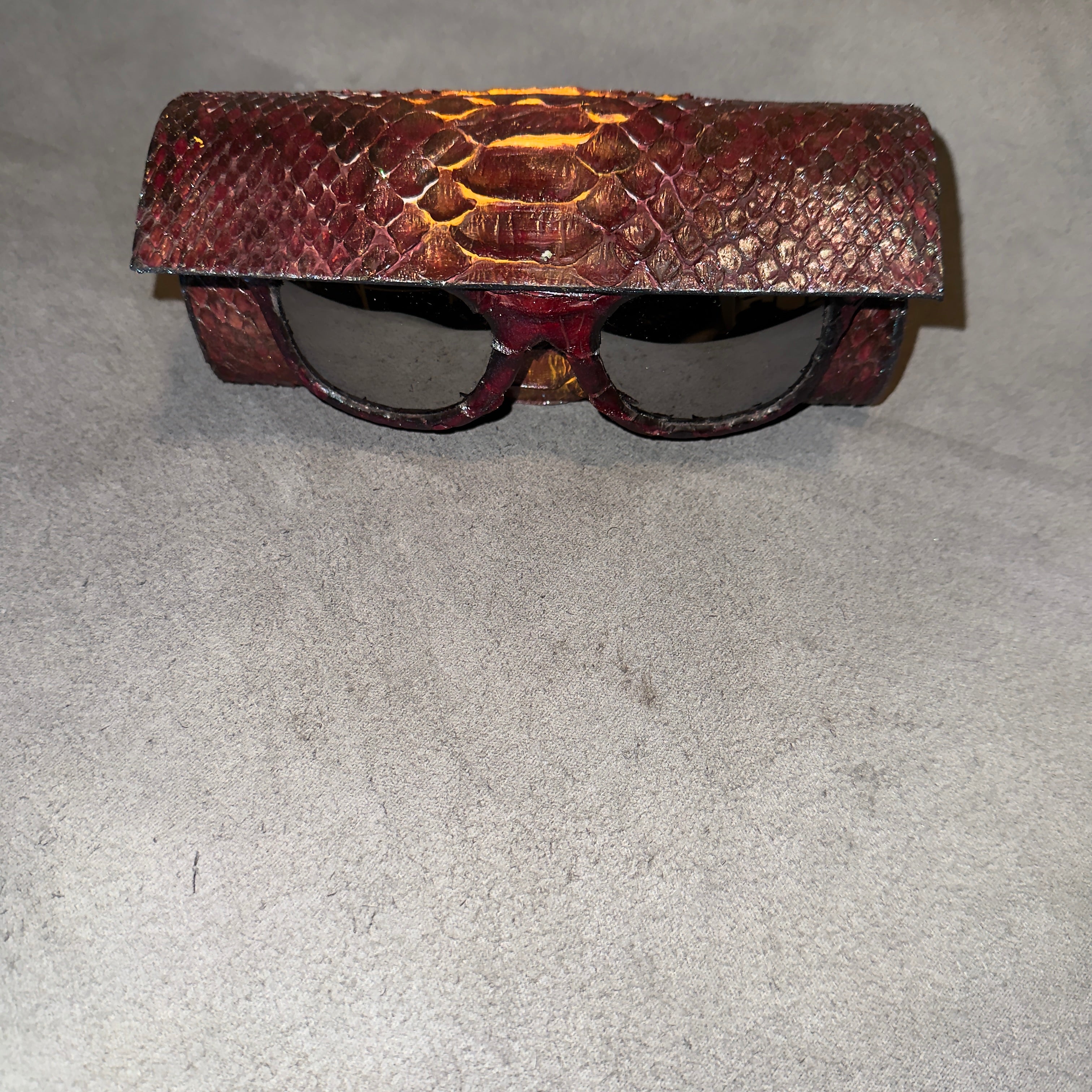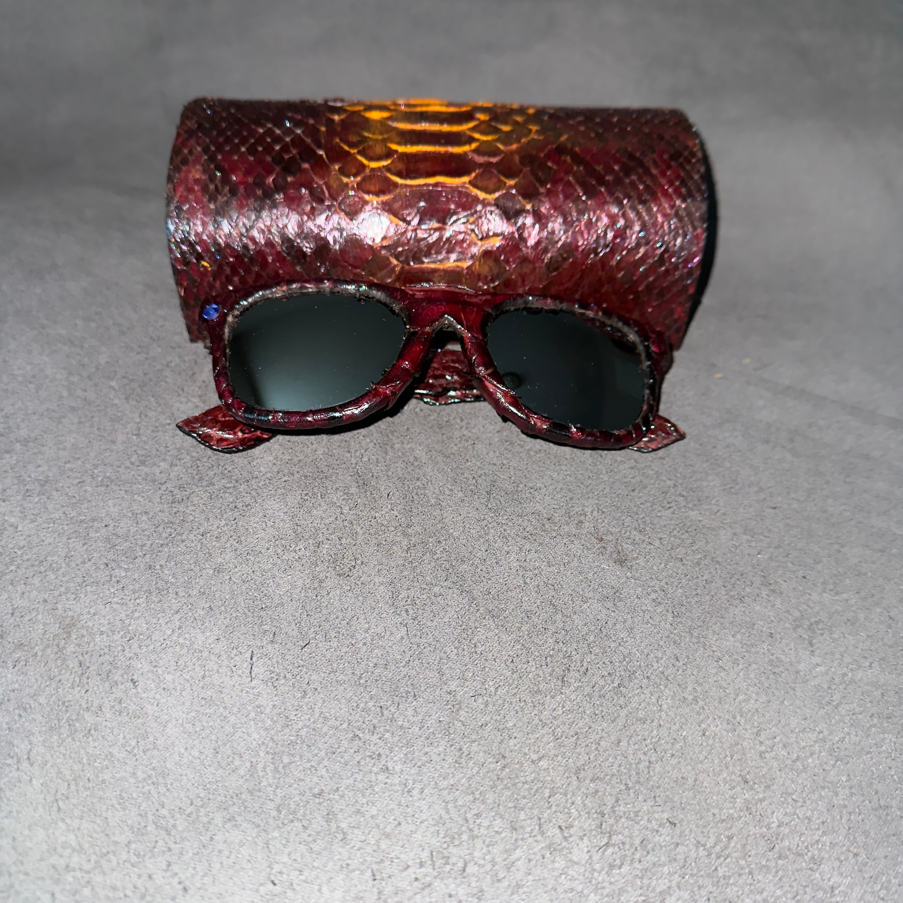 Python Lenny sunglasses are the ultimate expression of luxury eyewear, combining bold design with authentic craftsmanship. Handcrafted in New York City, Python Lenny features 100% genuine burgundy blue python leather, creating a distinctive texture and rich color depth that commands attention from every angle. The wayfarer-style frame blends classic sophistication with modern flair, making Python Lenny the perfect choice for those who value individuality and refined taste.